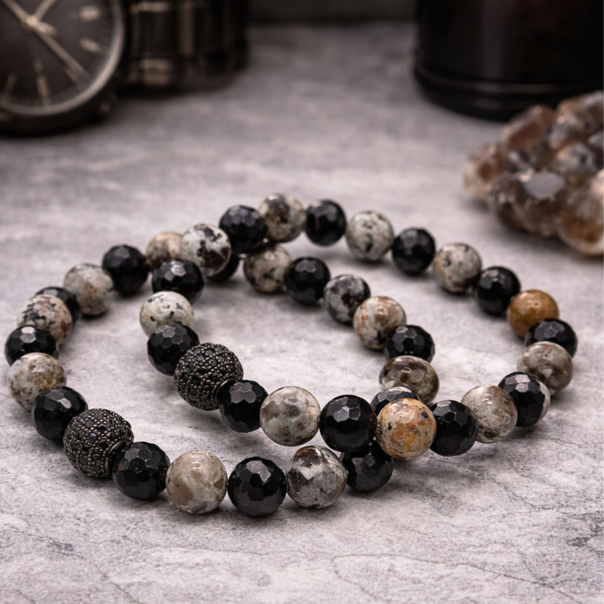 A karkötőt  8mm-es fazettált és síma ásvány gömbökből készítjük, speciális, gumis damilra fűzve.